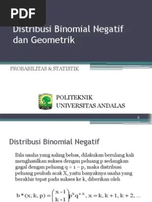 Model binomial negatif merupakan salah satu model regresi terapan dari generalized linear model . Salah satu metode yang bisa digunakan untuk menaksir parameternya antara lain . Sebaran binomial negatif, nilai harapan, variansi, skewness, kurtosis, fungsi pembangkit momen, fungsi karakteristik. Distribusi binomial negatif memiliki ciri bahwa peubah acaknya menyatakan banyaknya percobaan yang diperlukan untuk mendapatkan sebanyak k k sukses. Pdf | distribusi negatif binomial | find, read and cite all the research you need on researchgate.